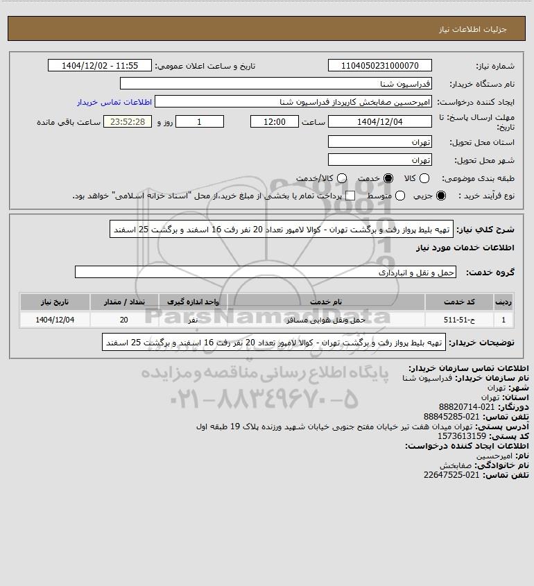 استعلام بها و موضوع استعلام استعلام تهیه بلیط پرواز رفت و برگشت تهران - کوالا لامپور تعداد 20 نفر رفت 16 اسفند و برگشت 25 اسفند به اطلاع کلیه شرکت‌ها و افراد متخصص واجد شرایط می‌رساند، آگهی گذار در نظر دارد از طریق استعلام بها، نسبت به انتخاب و دریافت پیشنهادات اقدام نماید. این استعلام با کد آگهی ثبت شده در سامانه خبرگزاری پارس نماد : 10340232 منتشر شده است. مشخصات استعلام : تاریخ شروع استعلام: 1404/12/02 آخرین مهلت ارسال پیشنهاد قیمت : 1404/12/04 و محل اجرای پروژه : استان مناقصات استان تهران میباشد. استعلام قیمت مورد درخواست : استعلام تهیه بلیط پرواز رفت و برگشت تهران - کوالا لامپور تعداد 20 نفر رفت 16 اسفند و برگشت 25 اسفند با دسته‌بندی‌های تخصصی و گروه های مرتبط : تورهای سیاحتی،زیارتی, استعلام اطلاع رسانی میگردد.