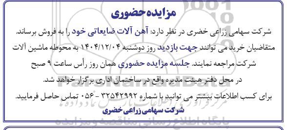 شرکت سهامی زراعی خضری در نظر دارد: آهن آلات ضایعاتی خود را به فروش برساند. متقاضیان خرید می توانند جهت بازدید روز دوشنبه 1404.12.04 به محوطه ماشین آلات شرکت مراجعه نمایند. جلسه مزایده حضوری همان روز راس ساعت 9 صبح در محل دفتر هیئت مدیره واقع در ساختمان اداری برگزار خواهد شد.
