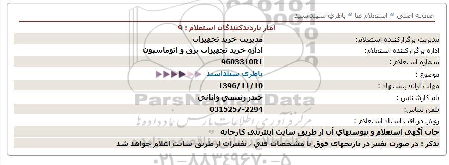 استعلام بها و موضوع استعلام استعلام ,استعلام باطری سیلداسید به اطلاع کلیه شرکتها و افراد متخصص واجد شرایط میرساند، آگهی گذار در نظر دارد از طریق استعلام بها، نسبت به انتخاب و دریافت پیشنهادات اقدام نماید. این استعلام با کد آگهی ثبت شده در سامانه خبرگزاری پارس نماد : 1034336 منتشر شده است. مشخصات استعلام : تاریخ شروع استعلام: 1396/11/03 آخرین مهلت ارسال پیشنهاد قیمت : 1397/01/14 و محل اجرای پروژه : استان اصفهان میباشد. استعلام قیمت مورد درخواست : استعلام ,استعلام باطری سیلداسید با دستهبندیهای تخصصی و گروه های مرتبط : منابع تغذیه, تجهیزات برق و الکترونیک, استعلام اطلاع رسانی میگردد.