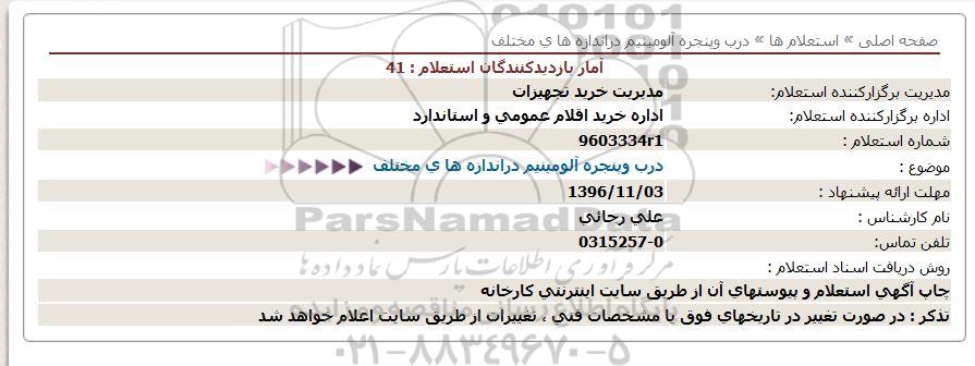 استعلام بها و موضوع استعلام استعلام درب وپنجره آلومینیم دراندازه های مختلف به اطلاع کلیه شرکتها و افراد متخصص واجد شرایط میرساند، آگهی گذار در نظر دارد از طریق استعلام بها، نسبت به انتخاب و دریافت پیشنهادات اقدام نماید. این استعلام با کد آگهی ثبت شده در سامانه خبرگزاری پارس نماد : 1034355 منتشر شده است. مشخصات استعلام : تاریخ شروع استعلام: 1396/11/03 آخرین مهلت ارسال پیشنهاد قیمت : 1396/11/03 و محل اجرای پروژه : استان اصفهان میباشد. استعلام قیمت مورد درخواست : استعلام درب وپنجره آلومینیم دراندازه های مختلف با دستهبندیهای تخصصی و گروه های مرتبط : آلومینیوم, انواع در و پنجره, استعلام اطلاع رسانی میگردد.