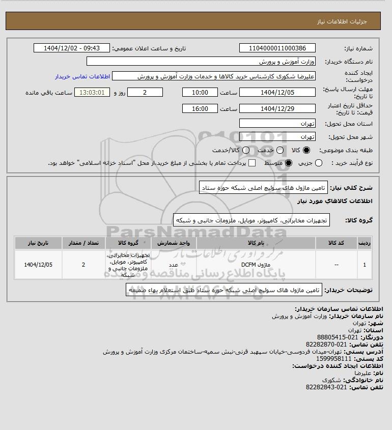 شرح کلی نیاز: تامین ماژول های سوئیچ اصلی شبکه حوزه ستاد