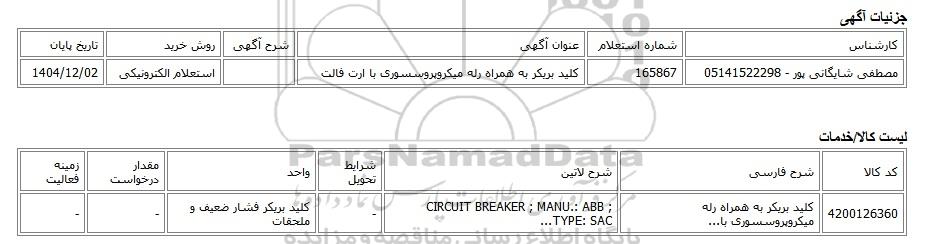| مصطفی شایگانی پور - 05141522298 | 165867 | کلید بریکر به همراه رله میکروپروسسوری با ارت فالت | استعلام الکترونیکی | 1404/12/02 |