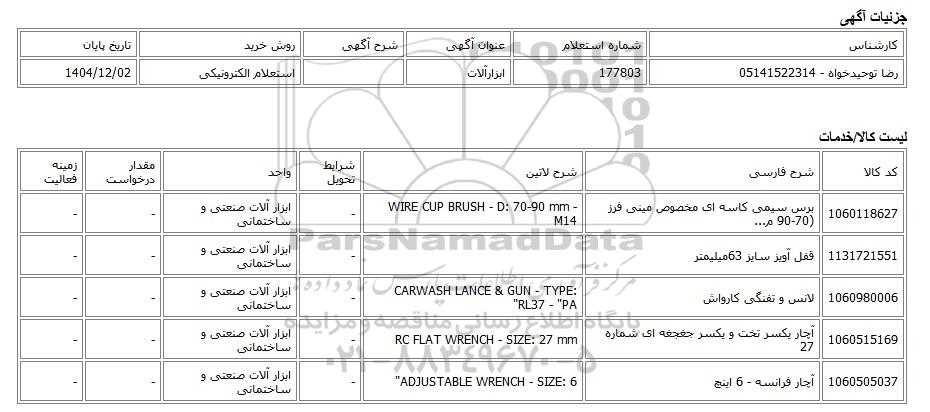 | رضا توحیدخواه - 05141522314 | 177803 | ابزارآلات | استعلام الکترونیکی | 1404/12/02 |