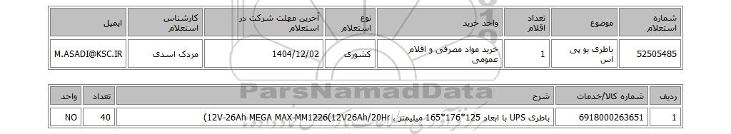 52505485باطری یو پی اس1خرید مواد مصرفی و اقلام عمومیکشوری1404/12/02مزدک اسدیM.ASADI@KSC.IR