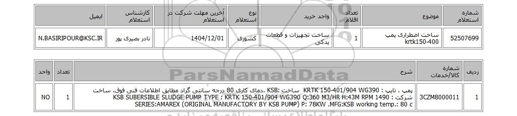 | 52507699 | ساخت اضطراری پمپ krtk150-400 | 1 | ساخت تجهیزات و قطعات یدکی | کشوری | 1404/12/01 | نادر بصیری پور | N.BASIRIPOUR@KSC.IR |