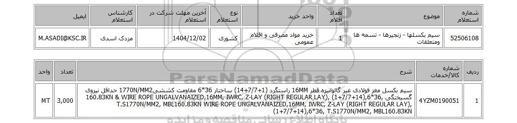| 52506108 | سیم بکسلها - زنجیرها - تسمه ها ومتعلقات | 1 | خرید مواد مصرفی و اقلام عمومی | کشوری | 1404/12/02 | مزدک اسدی | M.ASADI@KSC.IR |