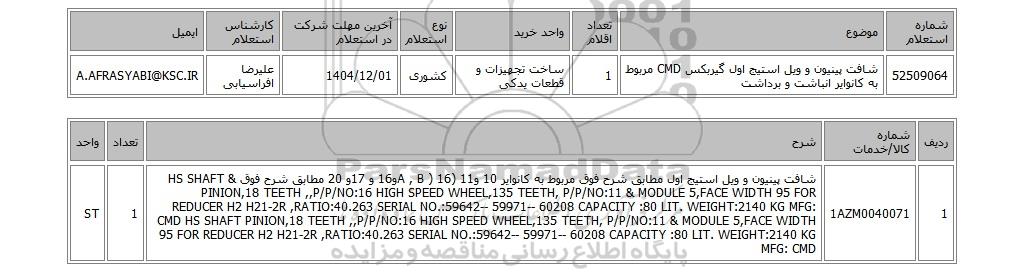 | 52509064 | شافت پینیون و ویل استیج اول گیربکس CMD مربوط به کانوایر انباشت و برداشت | 1 | ساخت تجهیزات و قطعات یدکی | کشوری | 1404/12/01 | علیرضا افراسیابی | A.AFRASYABI@KSC.IR |