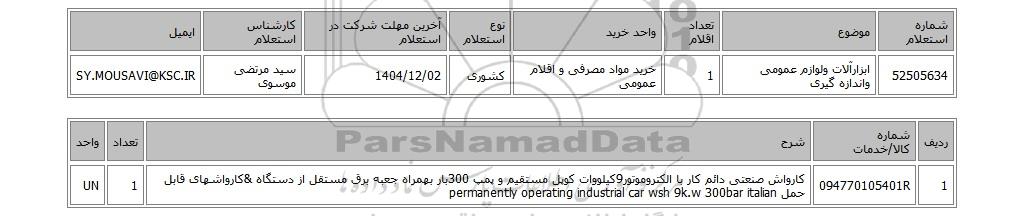 52505634ابزارآلات ولوازم عمومی واندازه گیری1خرید مواد مصرفی و اقلام عمومیکشوری1404/12/02سید مرتضی موسویSY.MOUSAVI@KSC.IR