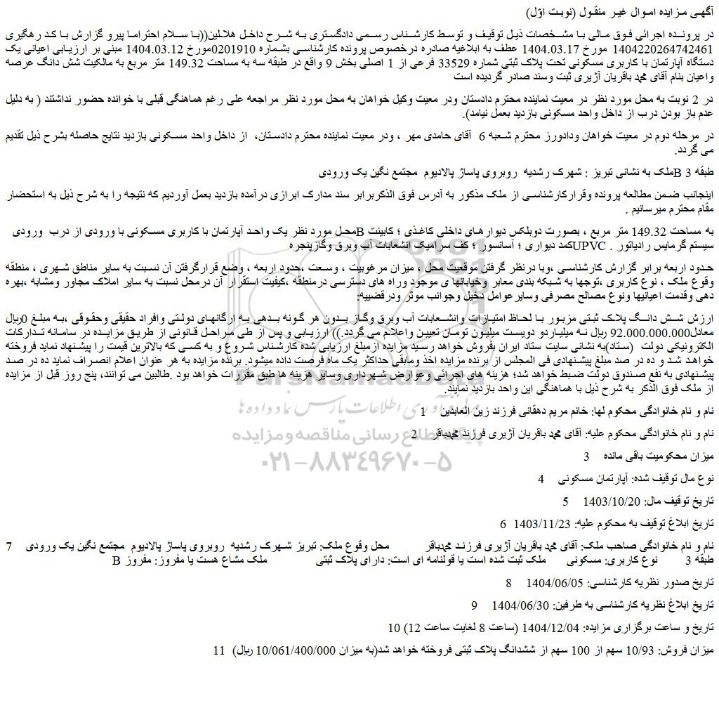 در پرونده اجرائی فوق مالی با مشخصات ذیل توقیف و توسط کارشناس رسمی دادگستری به شرح داخل هلالین((با سلام احتراما پیرو گزارش با کد رهگیری 1404220264742461 مورخ 1404.03.17 عطف به ابلاغیه صادره درخصوص پرونده کارشناسی بشماره 0201910مورخ 1404.03.12 مبنی بر ارزیابی اعیانی یک دستگاه آپارتمان با کاربری مسکونی تحت پلاک ثبتی شماره 33529 فرعی از 1 اصلی بخش 9 واقع در طبقه سه به مساحت 149.32 متر مربع به مالکیت شش دانگ عرصه واعیان بنام آقای محمد باقریان آژیری ثبت وسند صادر گردیده است