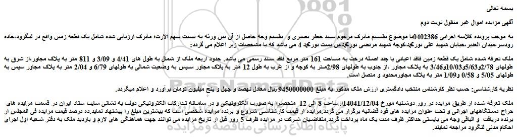 به موجب پرونده کلاسه اجرایی 0402386با موضوع تقسیم ماترک مرحوم سید جعفر نصیری و تقسیم وجه حاصل از آن بین ورثه به نسبت سهم الارث؛ ماترک ارزیابی شده شامل یک قطعه زمین واقع در لنگرود،جاده رودسر،میدان الغدیر،خیابان شهید علی نورمحمد،کوچه شهید مرتضی نورمحمد،بن بست نورمحمد 4 می باشد که با مشخصات زیر اعلام می گردد: