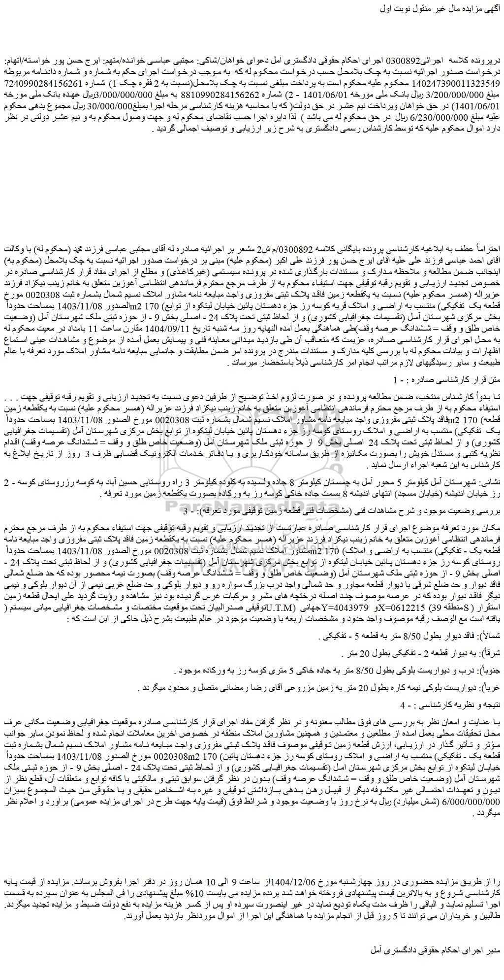 درپرونده کلاسه اجرائی0300892 اجرای احکام حقوقی دادگستری آمل دعوای خواهان/شاکی: مجتبی عباسی خوانده/متهم: ایرج حسن پور خواسته/اتهام: درخواست صدور اجرائیه نسبت به چک بلامحل حسب درخواست محکوم له که به موجب درخواست اجرای حکم به شماره و شماره دادنامه مربوطه 140247390011323549 محکوم علیه محکوم است به پرداخت مبلغی نسبت به چک بلامحل(نسبت به 2 فقره چک 1) شماره 7240990284156261 مبلغ 3/200/000/000 ریال بانک ملی مورخه 1401/06/01 - 2) شماره 8810990284156262 به مبلغ 3/000/000/000ریال عهده بانک ملی مورخه 1401/06/01) در حق خواهان وپرداخت نیم عشر در حق دولت( که با محاسبه هزینه کارشناسی مرحله اجرا بمبلغ30/000/000 ریال مجموع بدهی محکوم علیه مبلغ 6/230/000/000 ریال در حق محکوم له می باشد ) لذا دایره اجرا حسب تقاضای محکوم له و جهت وصول محکوم به و نیم عشر دولتی در نظر دارد اموال محکوم علیه که توسط کارشناس رسمی دادگستری به شرح زیر ارزیابی و توصیف اجمالی گردید .
