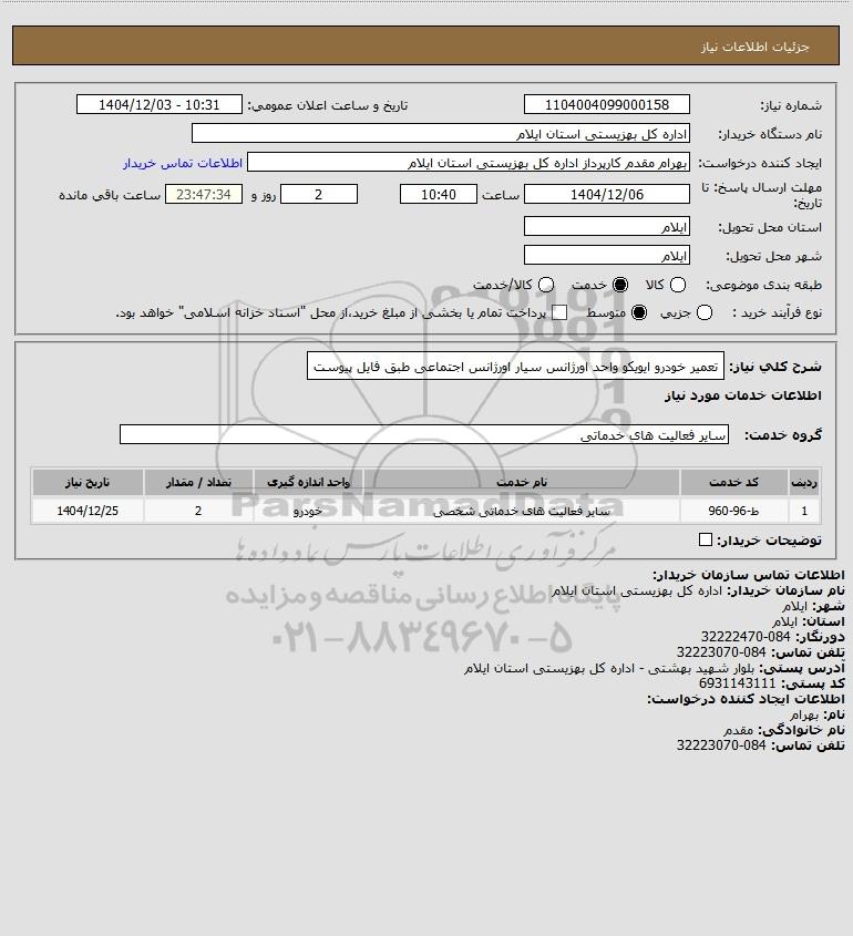 شرح کلی نیاز: تعمیر خودرو ایویکو واحد اورژانس سیار اورژانس اجتماعی طبق فایل پیوست