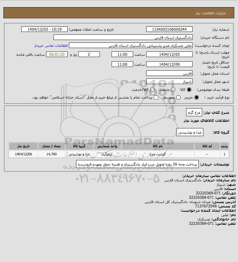 1 -- گوشت مرغ کیلوگرم غذا و نوشیدنی 14,700 1404/12/06