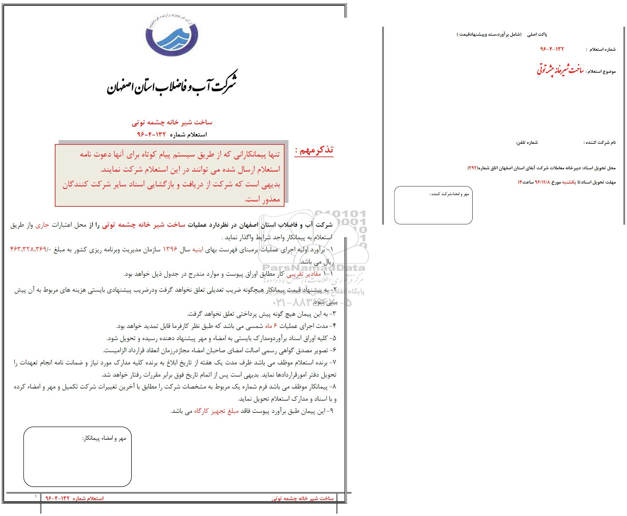 شرکت آب و فاضلاب استان اصفهان در نظر دارد ساخت شیرخانه چشمه توتی را از محل اعتبارت جاری و از طریق استعلام به پیمانکار واجد شرایط واگذار نماید.
