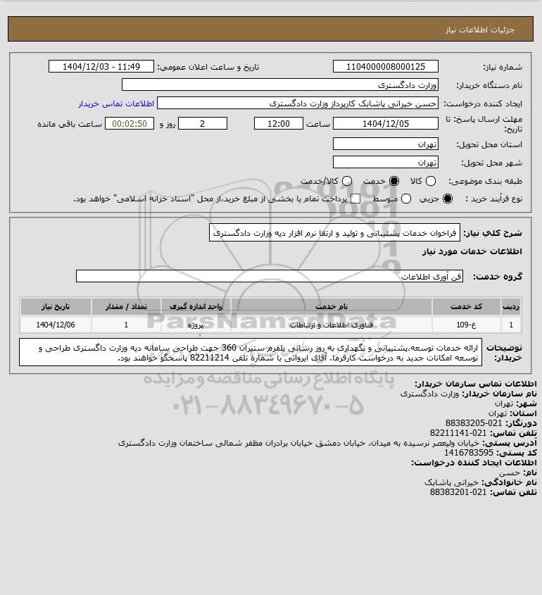شرح کلی نیاز: فراخوان خدمات پشتیبانی و تولید و ارتقا نرم افزار دیه وزارت دادگستری