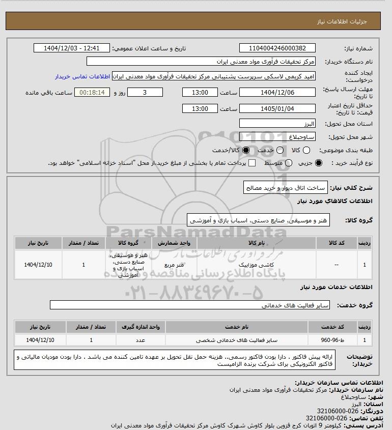 استعلام بها و موضوع استعلام استعلام ساخت اتاق دیوار و خرید مصالح به اطلاع کلیه شرکتها و افراد متخصص واجد شرایط میرساند، آگهی گذار در نظر دارد از طریق استعلام بها، نسبت به انتخاب و دریافت پیشنهادات اقدام نماید. این استعلام با کد آگهی ثبت شده در سامانه خبرگزاری پارس نماد : 10349143 منتشر شده است. مشخصات استعلام : تاریخ شروع استعلام: 1404/12/03 آخرین مهلت ارسال پیشنهاد قیمت : 1404/12/06 و محل اجرای پروژه : استان مناقصات استان البرز میباشد. استعلام قیمت مورد درخواست : استعلام ساخت اتاق دیوار و خرید مصالح با دستهبندیهای تخصصی و گروه های مرتبط : مصالح ساختمانی, کاشی و سرامیک, ساختمان, استعلام اطلاع رسانی میگردد.
