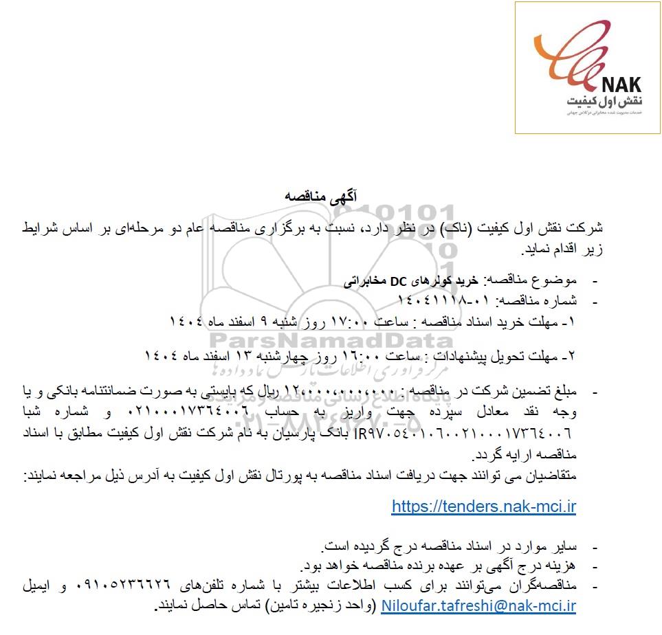مناقصه خرید کولرهای DC مخابراتی -مناقصه روز یکشنبه سوم اسفند ماه 1404 از کلیه افراد متخصص و شرکتها واجد شرایط دعوت به عمل میآید در مناقصه با کد خبرگزاری پارس نماد: 10350137 شرکت نمایند.