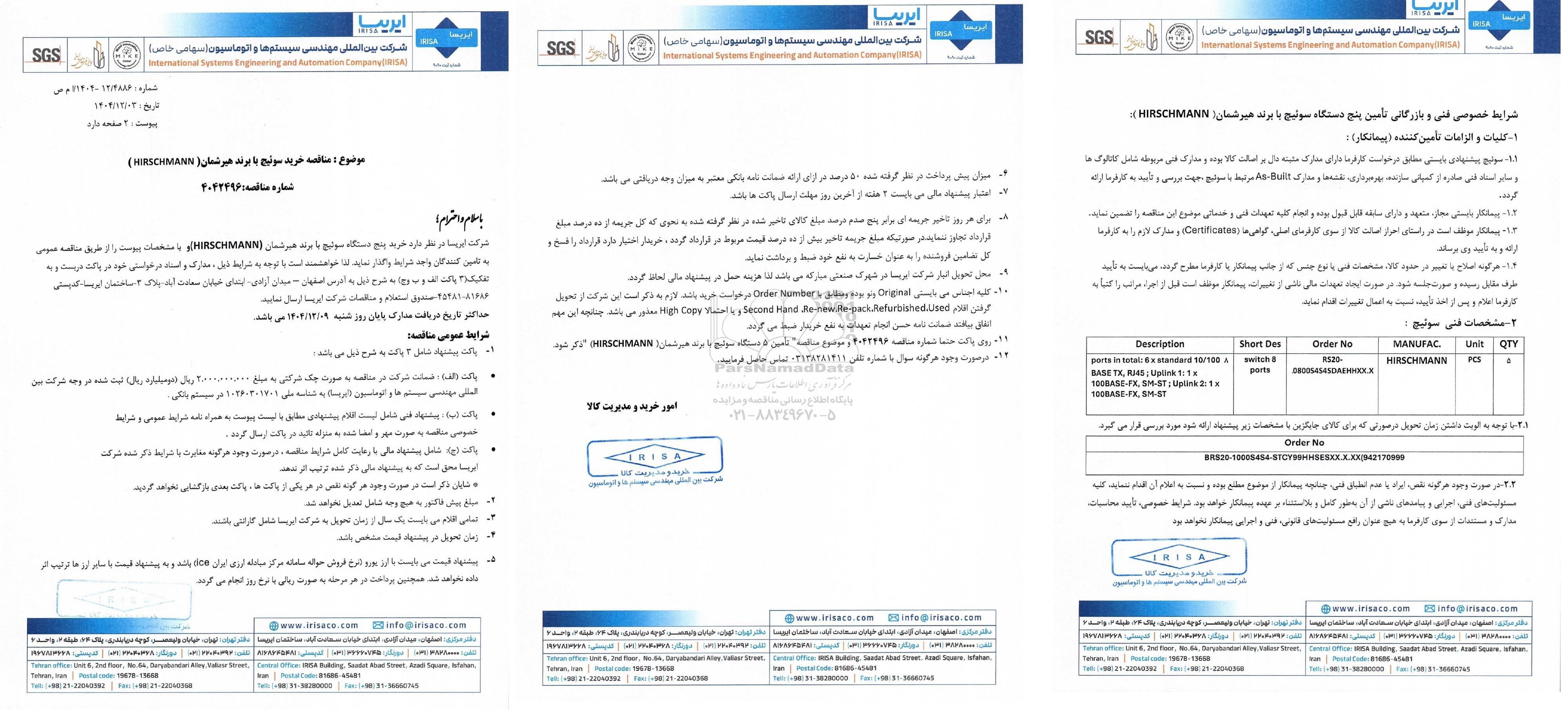 موضوع : مناقصه خرید سوئیچ با برند هیرشمان (HIRSCHMANN)