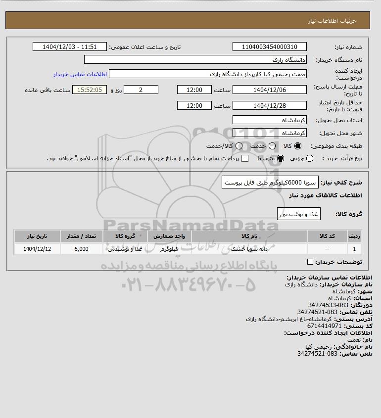 شرح کلی نیاز: سویا 6000کیلوگرم طبق فایل پیوست