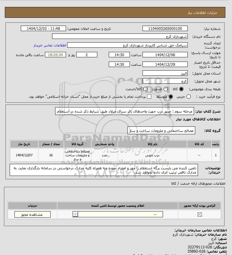 | 1 | -- | درب چوبی | عدد | مصالح ساختمانی و ملزومات ساخت و ساز | 16 | 1404/12/07 |