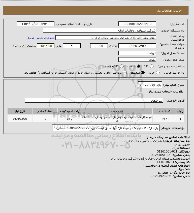 توضیحات خریدار:بازسازی کف انبار 5 مجموعه نازی آباد طبق لیست پیوست 09385262070 جعفرزاده