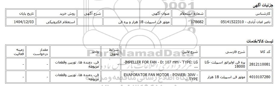 | ناصر امان آبادی - 05141522310 | 178682 | موتور فن اسپیلت 18 هزار و پره فن | استعلام الکترونیکی | 1404/12/03 |