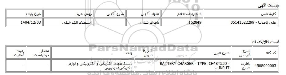 | علی ناصرنیا - 05141522299 | 162849 | باطری شارژر | استعلام الکترونیکی | 1404/12/03 |