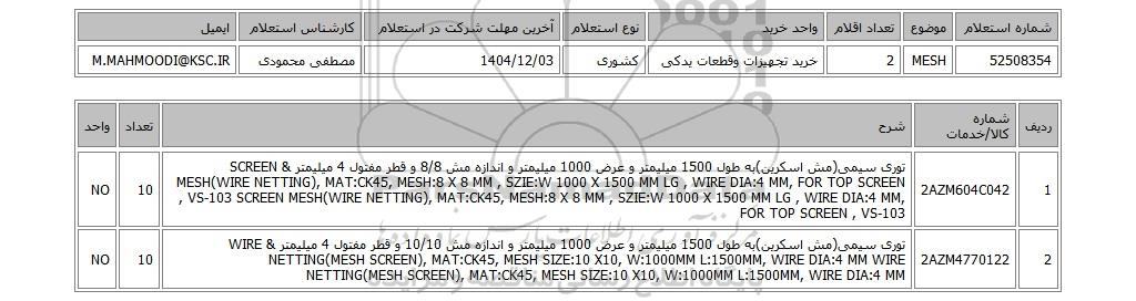 | 52508354 | MESH | 2 | خرید تجهیزات وقطعات یدکی | کشوری | 1404/12/03 | مصطفی محمودی | M.MAHMOODI@KSC.IR |