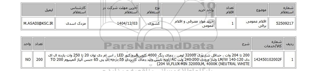 | 52509217 | اقلام عمومی برقی | 1 | خرید مواد مصرفی و اقلام عمومی | کشوری | 1404/12/03 | مزدک اسدی | M.ASADI@KSC.IR |