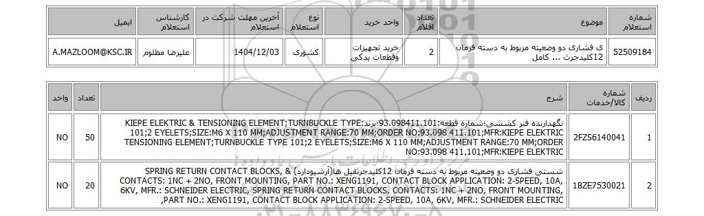 | 52509184 | ی فشاری دو وضعیته مربوط به دسته فرمان 12کلیدجرث ... کامل | 2 | خرید تجهیزات وقطعات یدکی | کشوری | 1404/12/03 | علیرضا مظلوم | A.MAZLOOM@KSC.IR |