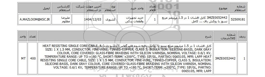 | 1 | 3MZE0052442 | کابل افشان 1 در 1.5 میلیمتر مربع نسوز با روکش بافته شده فایبرگلاس (آرشیو دارد) & HEAT RESISTING SINGLE CORE CABLE, SIZE: 1 X 1.5 MM, CONDUCTOR: FINE-WIRE, TINNED-COPPER, CLASS 5, INSULATION: SILICONE-BASIS, DARK GRAY COLOUR, CORE COVERED: GLASS-FIBRE BRAIDING WITH SILICON VARNISH, NOMINAL VOLTAGE: 0.6/1 KV, TEMPERATURE RANGE: UP TO +180 °C, SHORT-TERM: +200°C, TYPE: SIF/GL, PARTNO: 0065105, MFR: LAPP HEAT RESISTING SINGLE CORE CABLE, SIZE: 1 X 1.5 MM, CONDUCTOR: FINE-WIRE, TINNED-COPPER, CLASS 5, INSULATION: SILICONE-BASIS, DARK GRAY COLOUR, CORE COVERED: GLASS-FIBRE BRAIDING WITH SILICON VARNISH, NOMINAL VOLTAGE: 0.6/1 KV, TEMPERATURE RANGE: UP TO +180 °C, SHORT-TERM: +200°C, TYPE: SIF/GL, PARTNO: 0065105, MFR: LAPP | 400 | MT |