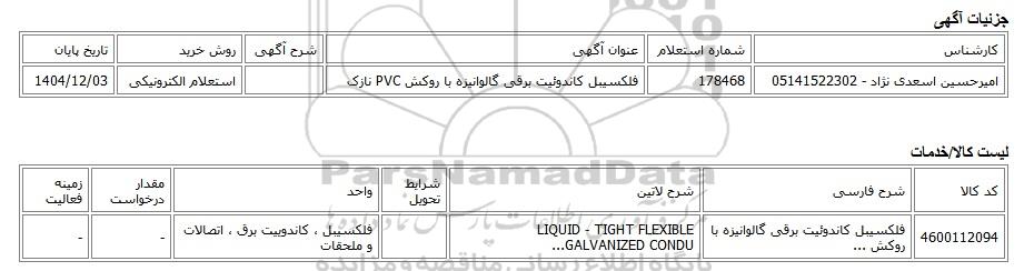 | امیرحسین اسعدی نژاد - 05141522302 | 178468 | فلکسیبل کاندوئیت برقی گالوانیزه با روکش PVC نازک | استعلام الکترونیکی | 1404/12/03 |