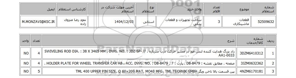 52509632قطعات ماشینکاری3ساخت تجهیزات و قطعات یدکیاستانی1404/12/03محمد رضا منزوی زادهM.MONZAVI@KSC.IR