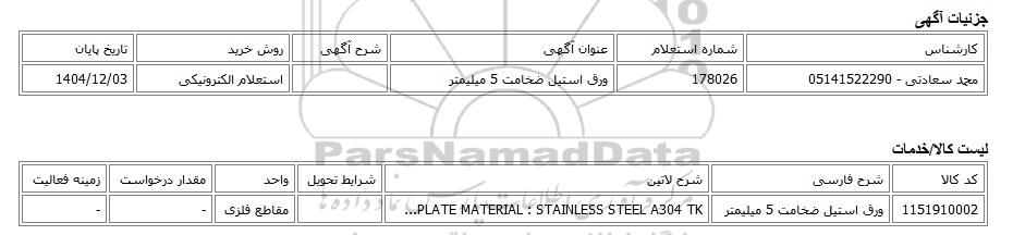 محمد سعادتی - 05141522290178026ورق استیل ضخامت 5 میلیمتراستعلام الکترونیکی1404/12/03