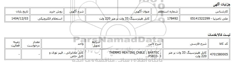 | علی ناصرنیا - 05141522299 | 178492 | کابل هیترسینگ 33 وات بر متر 220 ولت | استعلام الکترونیکی | 1404/12/03 |