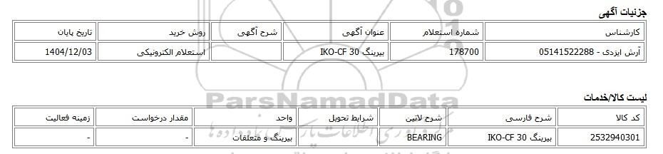 | آرش ایزدی - 05141522288 | 178700 | بیرینگ IKO-CF 30 | استعلام الکترونیکی | 1404/12/03 |