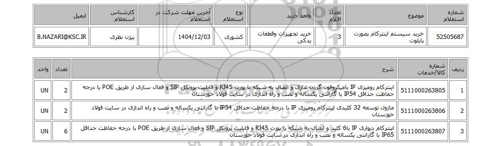 | 52505687 | خرید سیستم اینترکام بصورت پایلوت | 3 | خرید تجهیزات وقطعات یدکی | کشوری | 1404/12/03 | بیژن نظری | B.NAZARI@KSC.IR |