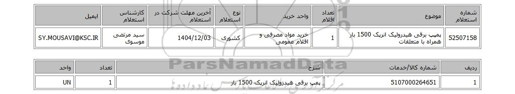 | 52507158 | پمپپ برقی هیدرولیک انرپک 1500 بار همراه با متعلقات | 1 | خرید مواد مصرفی و اقلام عمومی | کشوری | 1404/12/03 | سید مرتضی موسوی | SY.MOUSAVI@KSC.IR |