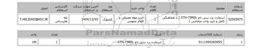 | 52505975 | اسمارت برد سی تاچ STH-75M2L ( با هماهنگی کامل و تایید واحد متقاضی ) | 1 | خرید مواد مصرفی و اقلام عمومی | کشوری | 1404/12/03 | طه هلیسائی | T.HELISAEI@KSC.IR |