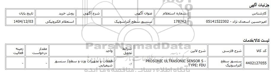| امیرحسین اسعدی نژاد - 05141522302 | 178742 | سنسور سطح آلتراسونیک | استعلام الکترونیکی | 1404/12/03 |