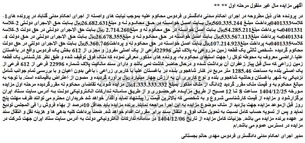 در پرونده های ذیل مطروحه در اجرای احکام مدنی دادگستری فردوس محکوم علیه بموجب نیابت های واصله از اجرای احکام مدنی گناباد در پرونده های1- کلاسه0401333پرداخت مبلغ 560.335.244ریال بابت اصل خواسته در حق محکوم له و مبلغ26.682.631ریال بابت حق الاجرای دولتی 2-کلاسه 0401331به پرداخت مبلغ54.285.211ریال بابت اصل خواسته در حق محکوم له و مبلغ2.714.260 ریال بابت حق الاجرای دولتی در حق دولت 3-کلاسه 0401334به پرداخت مبلغ533.567.113ریال بابت اصل خواسته در حق محکوم له و مبلغ26.678.355ریال بابت حق الاجرای دولتی در حق دولت 4-کلاسه0401335به پرداخت مبلغ107.214.923ریال بابت اصل خواسته در حق محکوم له و پرداخت5.360.746ریال بابت حق الاجرای دولتی در حق دولت محکوم گردیده ،شخص ثالثی یک قطعه زمین مزروعی به پلاک ثبتی 22996فرعی از یک اصلی مفروز و مجزی از 612 بخش یک فردوس واقع در باغستان علیا-اراضی معروف به محوطه توکل را جهت استیفای محکوم به، پرونده های مذکور معرفی نموده که ملک فوق توقیف شده و طبق نظر کارشناس یک قطعه زمین زراعی که سال قبل پیاز زعفران آن برداشت شده و درحال حاضر کاشت نمی باشد و دارای سند مالکیت پلاک شماره 22996 فرعی از 612 فرعی از یک اصلی بلده به مساحت 1285.46 متر مربع در کنار شاهجوی بلده در باغستان علیا با کاربری زراعی ، باغی بدون اعیان و با بررسی تمام جوانب شامل نزدیکی به شهر باغستان وحاشیه شاهجوی بلده و نوع کاربری آن به ارزش چهار میلیارد ریال برآورد گردیده و مصون از اعتراض باقیمانده است. با توجه به مبالغ محکوم به و قیمت ملک مقرر گردید 2دانگ از ملک مذکور بمبلغ 1.333.333.332ریال مزایده شود.به تقاضای محکوم له مقررگردیده مرحله اول مزایده مورخه 1404/12/25 ساعت 8 تا 12 صبح از طریق مزایده غیرحضوری و از طریق سامانه تدارکات الکترونیکی دولت به آدرس سایت ستاد ایران برگزارشود و مزایده از قیمت کارشناسی شروع و به شخصی که بالاترین قیمت را پیشنهاد نماید واگذار خواهد شد خریداران محترم می توانند ظرف مهلت پنج روز قبل ازموعد مزایده جهت بازدید از ملک موضوع مزایده به این اجرا مراجعه نمایند. برنده مزایده باید حداقل 10درصد از بهاء فروش را فی المجلس تودیع نماید و پس از تسویه حساب کامل نسبت به تحویل ملک فوق و انتقال سند برابر مقررات اقدام خواهد شد. ضمناً پرداخت کلیه بدهی ها و هزینه نقل و انتقال سند بر عهده برنده مزایده می باشد. جزئیات کامل مزایده از تاریخ 1404/12/06 در سامانه تدارکات الکترونیکی دولت به آدرس سایت ستاد ایران جهت شرکت در مزایده در دسترس عموم می باشد./م