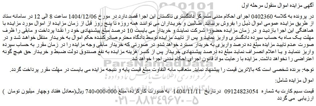 در پرونده به کلاسه 0402360 اجرای احکام مدنی متمرکز دادگستری تاکستان این اجرا قصد دارد در مورخ 1404/12/06 ساعت 8 الی 12 در سامانه ستاد از طریق مزایده عمومی اموال ذیل را بفروش برساند. طالبین و خریداران می توانند همه روزه تا پنج روز قبل از زمان مزایده از اموال مورد مزایده با هماهنگی این اجرا بازدید و در زمان مزایده حضورا شرکت نمایند و خریدار می بایست 10 درصد مبلغ پیشنهادی خود را نقدا پرداخت و مابقی را ظرف مهلت یک ماه به حساب سپرده دادگستری واریز نماید و پس از تایید مزایده توسط دادگاه محترم صادرکننده حکم اموال به خریدار منتقل خواهد شد و در صورت عدم تایید مزایده مبلغ ده درصد واریزی به خریدار مسترد خواهد شدو در صورتی که خریدار مابقی وجه مزایده را در زمان مقرر به حساب سپرده واریز ننماید و یا اعلام انصراف نماید مبلغ ده درصد پیشنهادی خریدار پس از کسر هزینه مزایده به نفع صندوق دولت ضبط و خریدار حق هیچ گونه اعتراضی را نخواهد داشت. مزایده با رعایت مواد قانون اجرای احکام مدنی اجرا خواهد شد.