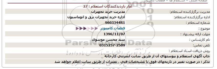 استعلام بها و موضوع استعلام استعلام, استعلام قطعات کامپیوتر به اطلاع کلیه شرکتها و افراد متخصص واجد شرایط میرساند، آگهی گذار در نظر دارد از طریق استعلام بها، نسبت به انتخاب و دریافت پیشنهادات اقدام نماید. این استعلام با کد آگهی ثبت شده در سامانه خبرگزاری پارس نماد : 1035495 منتشر شده است. مشخصات استعلام : تاریخ شروع استعلام: 1396/11/04 آخرین مهلت ارسال پیشنهاد قیمت : 1396/11/07 و محل اجرای پروژه : استان اصفهان میباشد. استعلام قیمت مورد درخواست : استعلام, استعلام قطعات کامپیوتر با دستهبندیهای تخصصی و گروه های مرتبط : کامپیوتر, استعلام اطلاع رسانی میگردد.