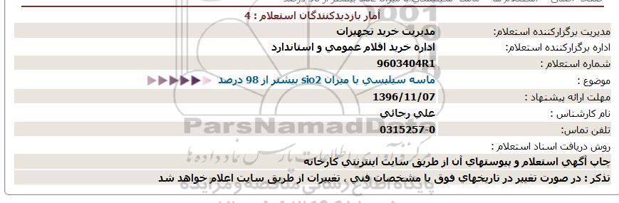 استعلام بها و موضوع استعلام استعلام ، استعلام ماسه سیلیسی به اطلاع کلیه شرکتها و افراد متخصص واجد شرایط میرساند، آگهی گذار در نظر دارد از طریق استعلام بها، نسبت به انتخاب و دریافت پیشنهادات اقدام نماید. این استعلام با کد آگهی ثبت شده در سامانه خبرگزاری پارس نماد : 1035598 منتشر شده است. مشخصات استعلام : تاریخ شروع استعلام: 1396/11/04 آخرین مهلت ارسال پیشنهاد قیمت : 1396/11/07 و محل اجرای پروژه : استان اصفهان میباشد. استعلام قیمت مورد درخواست : استعلام ، استعلام ماسه سیلیسی با دستهبندیهای تخصصی و گروه های مرتبط : مصالح ساختمانی, مواد معدنی, استعلام اطلاع رسانی میگردد.