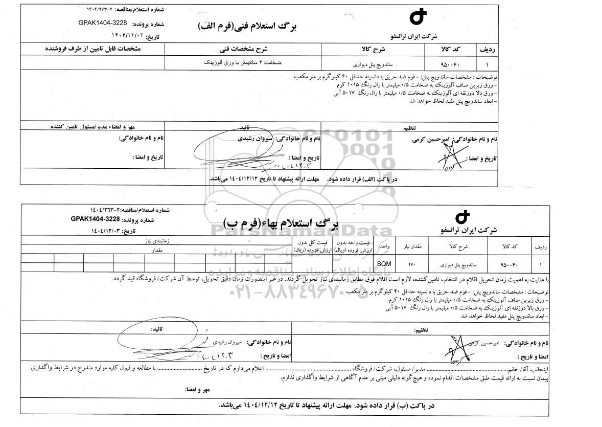 | 1 | 950040 | ساندویچ پنل دیواری | 270 | SQM |