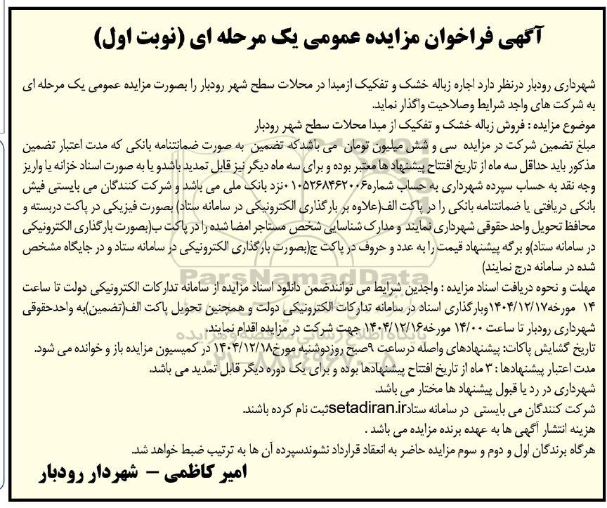 موضوع مزایده : فروش زباله خشک و تفکیک از مبدا محلات سطح شهر رودبار