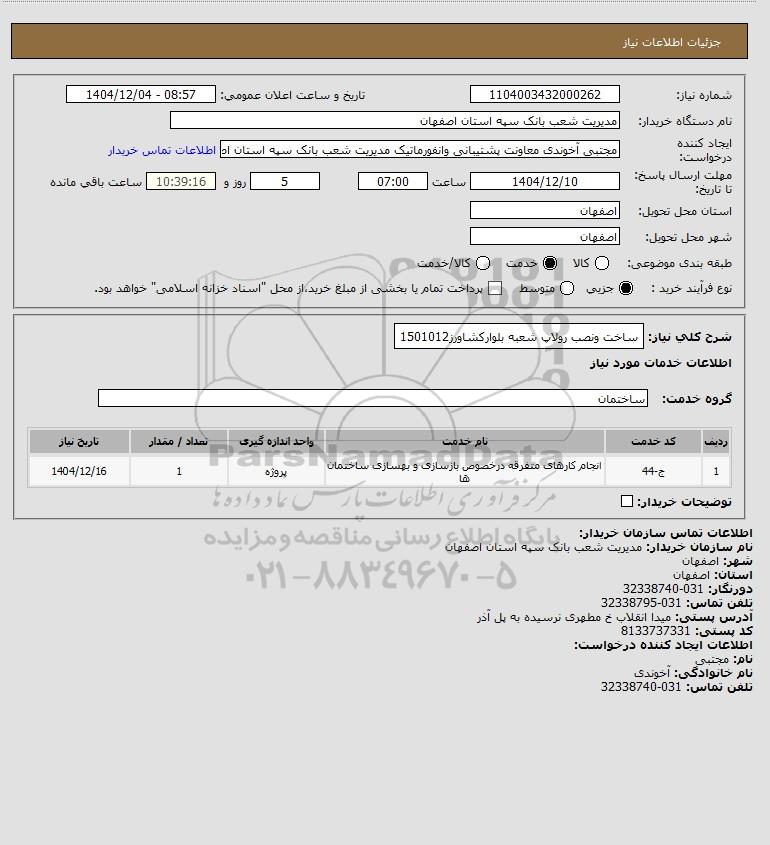 شرح کلی نیاز: ساخت ونصب رولاپ شعبه بلوارکشاورز1501012
