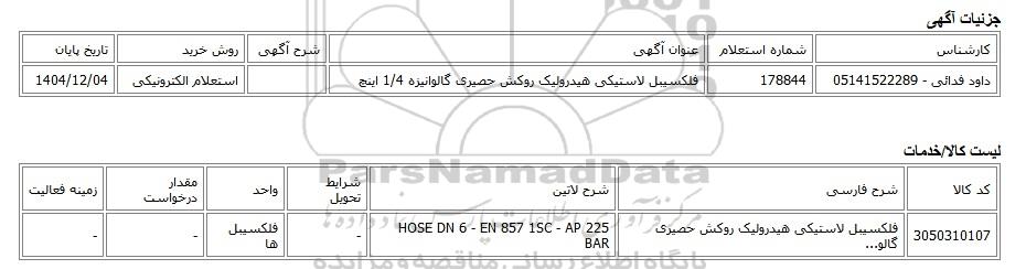 داود فدائی - 05141522289178844فلکسیبل لاستیکی هیدرولیک روکش حصیری گالوانیزه 1/4 اینچاستعلام الکترونیکی1404/12/04