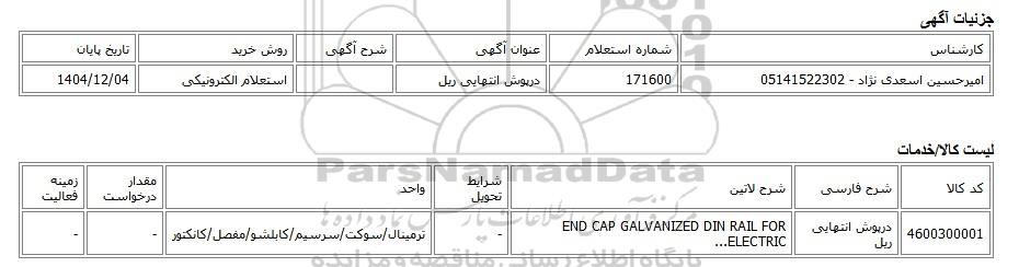 | امیرحسین اسعدی نژاد - 05141522302 | 171600 | درپوش انتهایی ریل | استعلام الکترونیکی | 1404/12/04 |