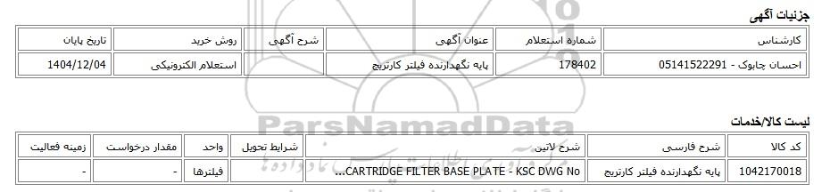| احسان چابوک - 05141522291 | 178402 | پایه نگهدارنده فیلتر کارتریج | استعلام الکترونیکی | 1404/12/04 |